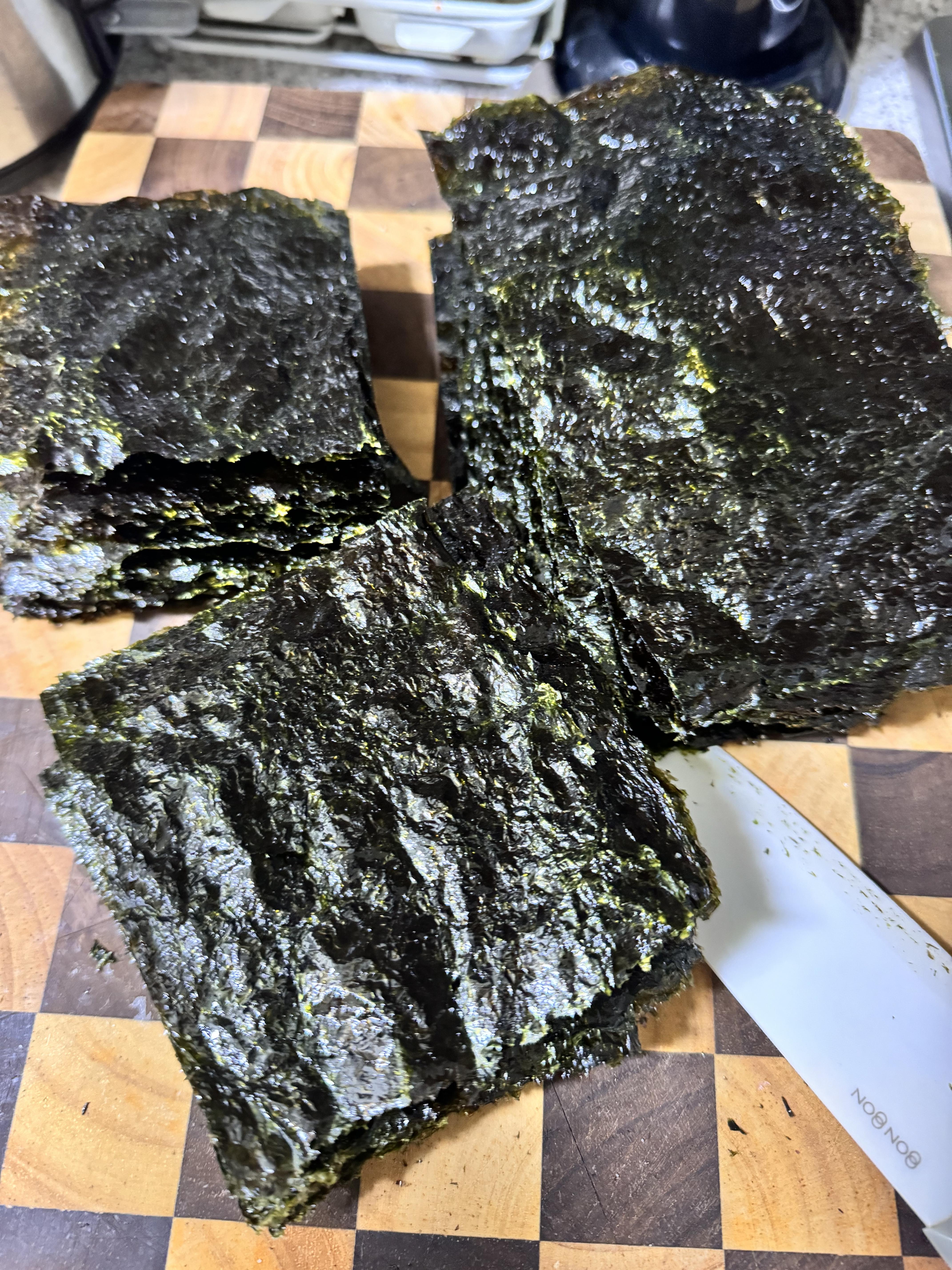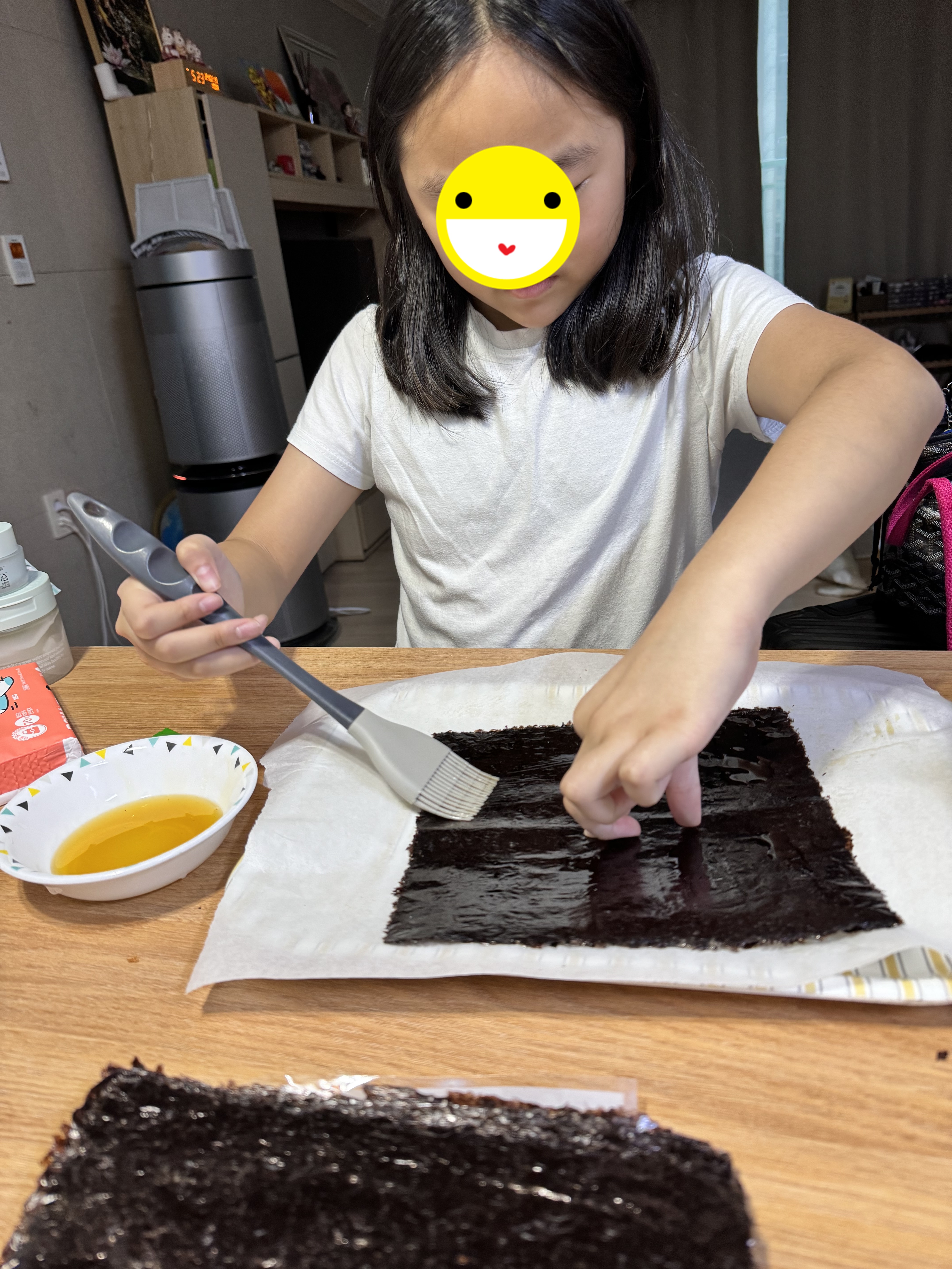 참기름+올리브유 살살 발라서 구운소금 살살 뿌렸어요..