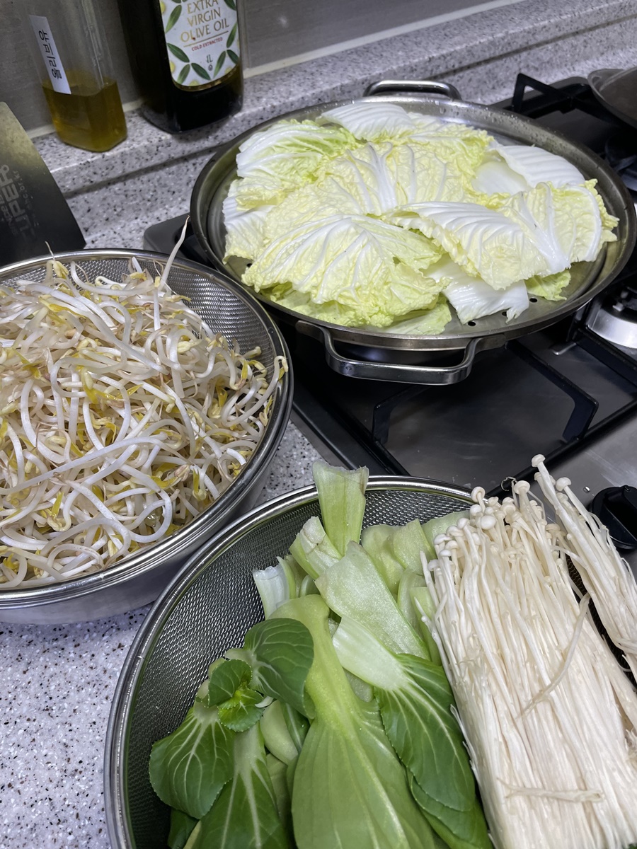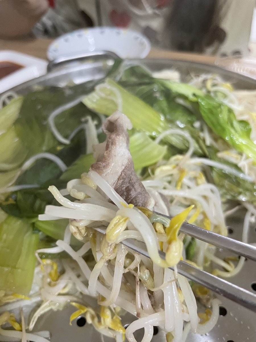 야채랑 소고기를 같이 쪄서 샤브소스에 찍어먹었어요.