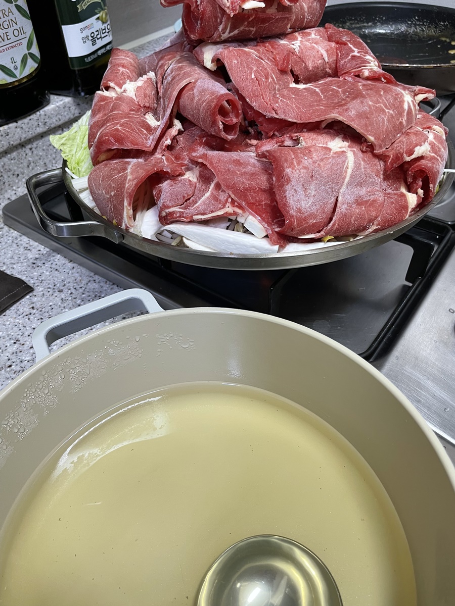 육수를 끓여서 야채와 소고기에 같이 끓여줬어요.
