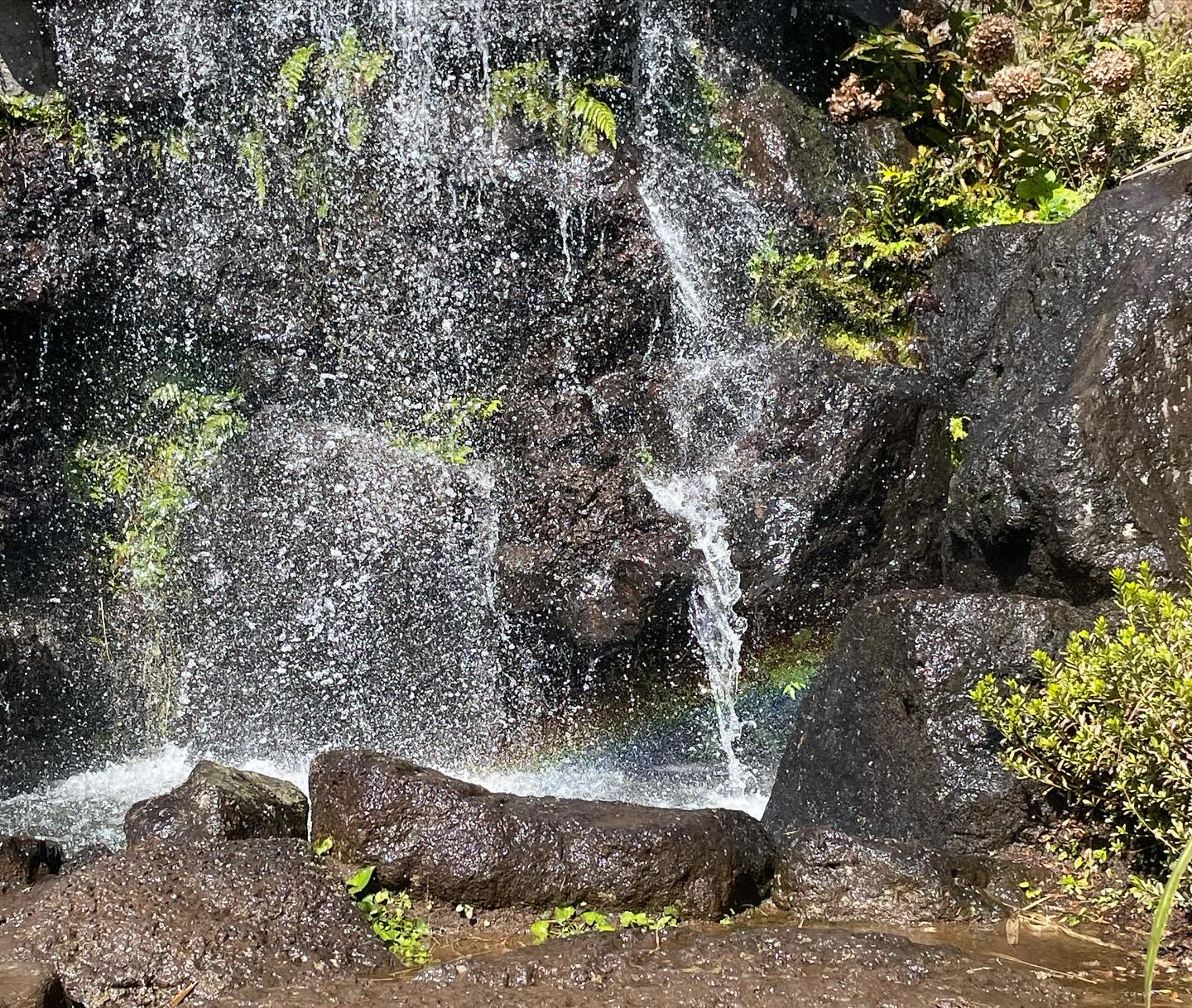 뒤로 인공폭포가 보이고 폭포를 통과해서