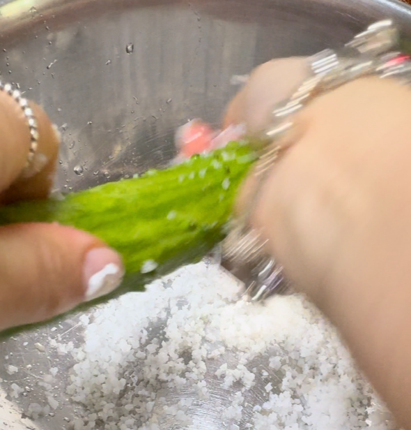 오이는 굵은 소금으로 닦아줬어요.