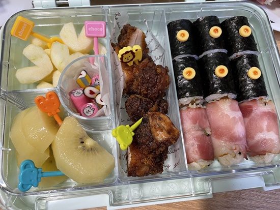 꼬마김밥 + 볶음밥베이컨말이 + 블랙알리오치킨 + 하트모양사과  + 골드키위 + 사탕