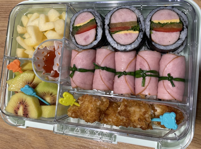 꼬마김밥 + 볶음밥베이컨말이 + 블랙알리오치킨 + 하트모양사과 + 골드키위 + 사탕